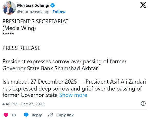 President Asif Ali Zardari expressed deep sorrow and acknowledged her contributions to economic governance and financial management. He said her services would be remembered as instrumental in strengthening Pakistan’s institutions.