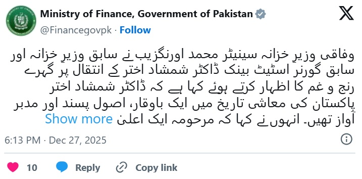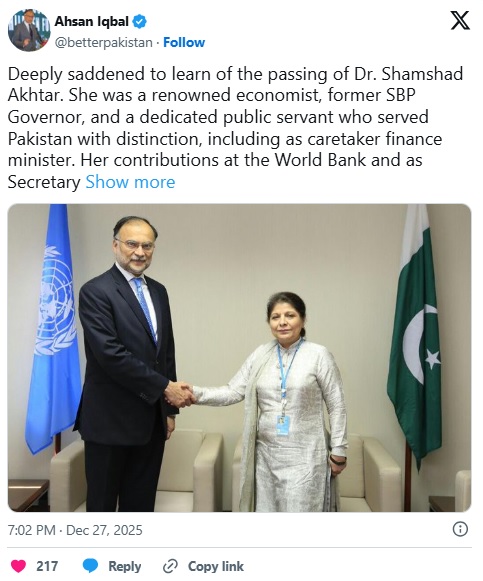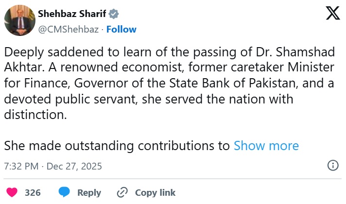 Finance Minister Muhammad Aurangzeb called Dr Akhtar a principled and dignified voice in Pakistan’s economic history. He praised her integrity, professionalism, and long public service.