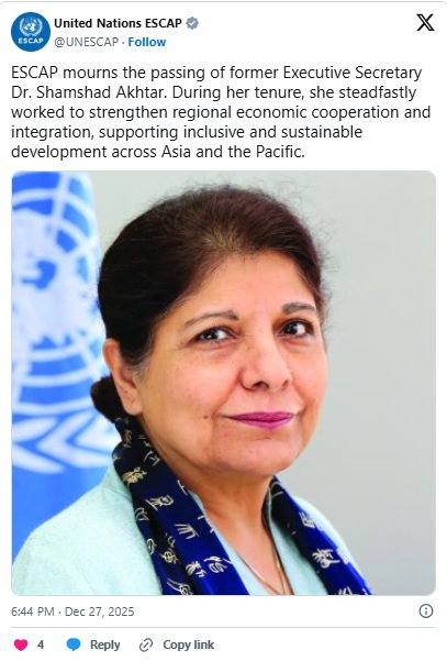 ESCAP, where Dr Akhtar previously served as executive secretary, said she worked steadfastly to strengthen regional cooperation and promote inclusive and sustainable development across Asia and the Pacific.